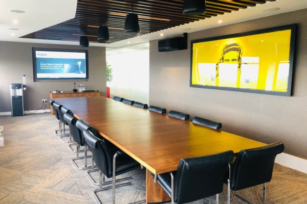 Audio upgrade in this boardroom from in-ceiling speakers to JBL pendants to improve the sound coverage and quality.